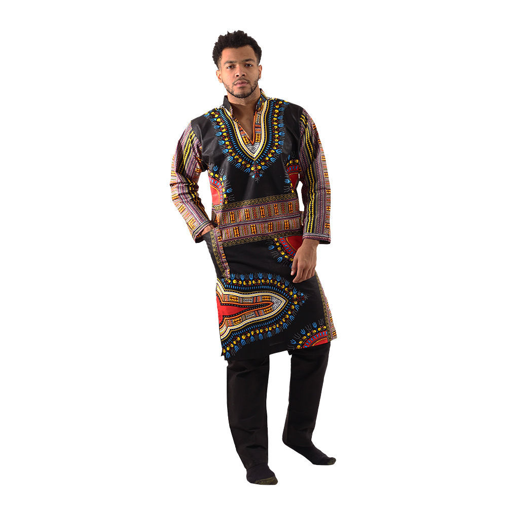 Bold and stylish, this African-Made Traditional Tunic: Black makes an authentically African addition to any wardrobe. The traditional tunic has a V-neck with an open mandarin collar, long sleeves, and falls at the knee. It features a colorful and varied pattern of traditional African designs in red, blue, yellow, and purple against a black background. C-U252