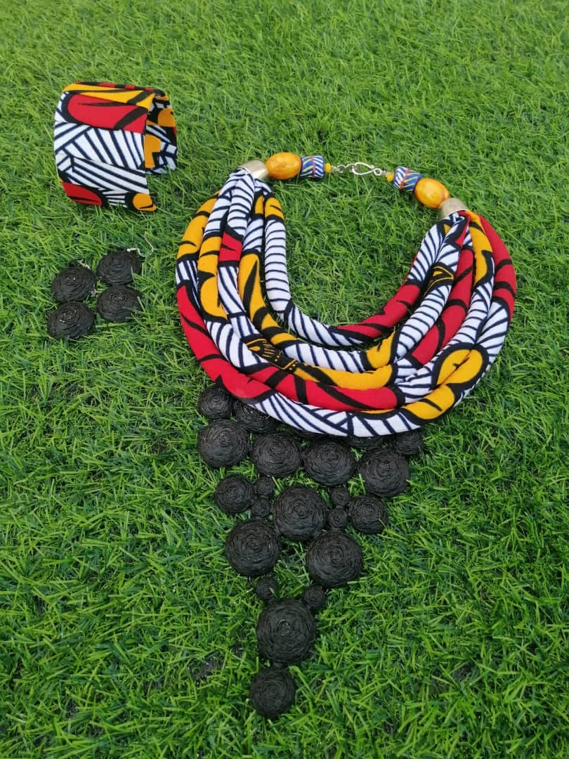 Beautiful neck statement to start any conversation. Enter a room with this on and stand out with this unique accessory. Actual piece maybe lighter or darker than picture. Sold as a set (Bangle, Earrings, Necklace).
