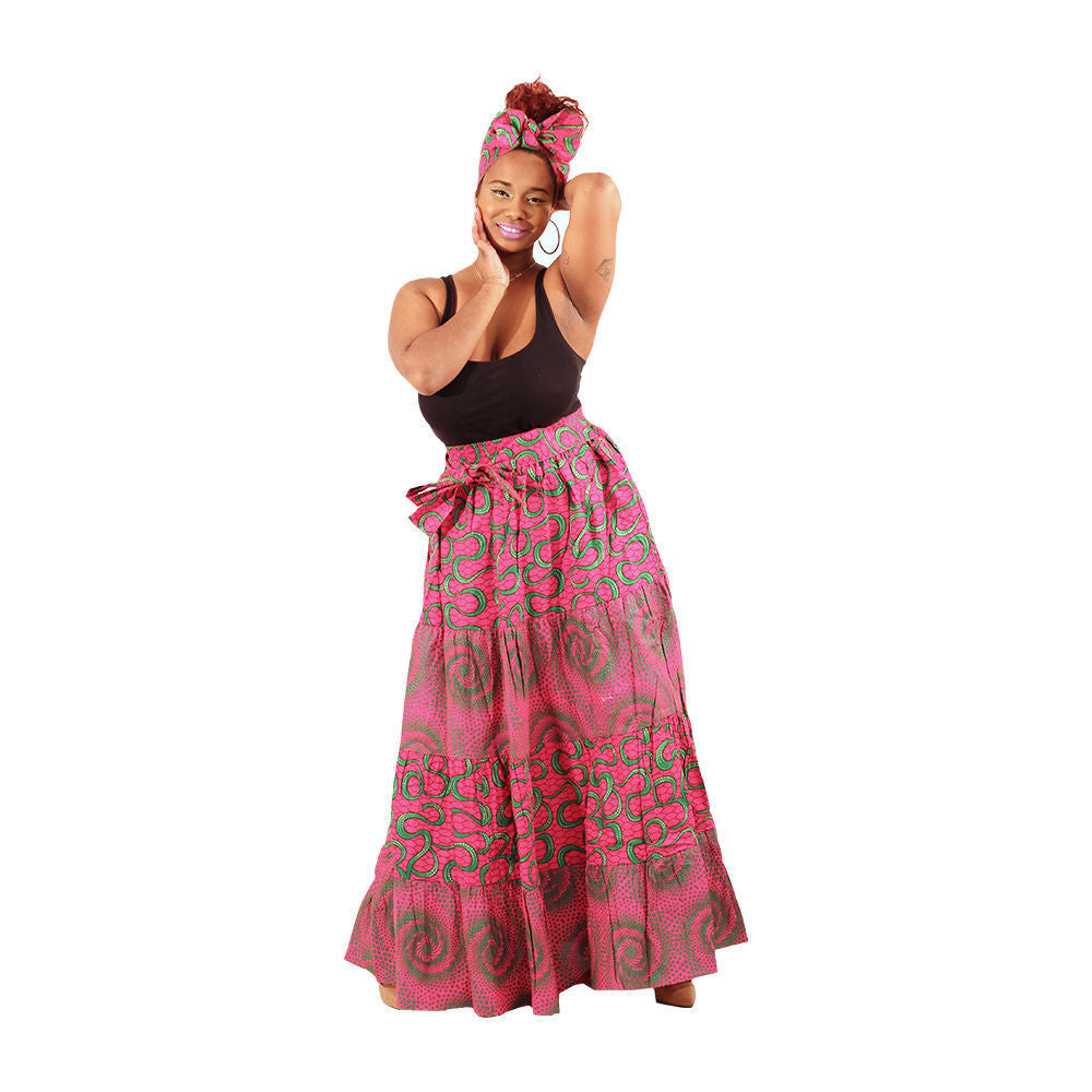 The skirt is 42” in length and the waist is 28” flat and will stretch up to 56”.