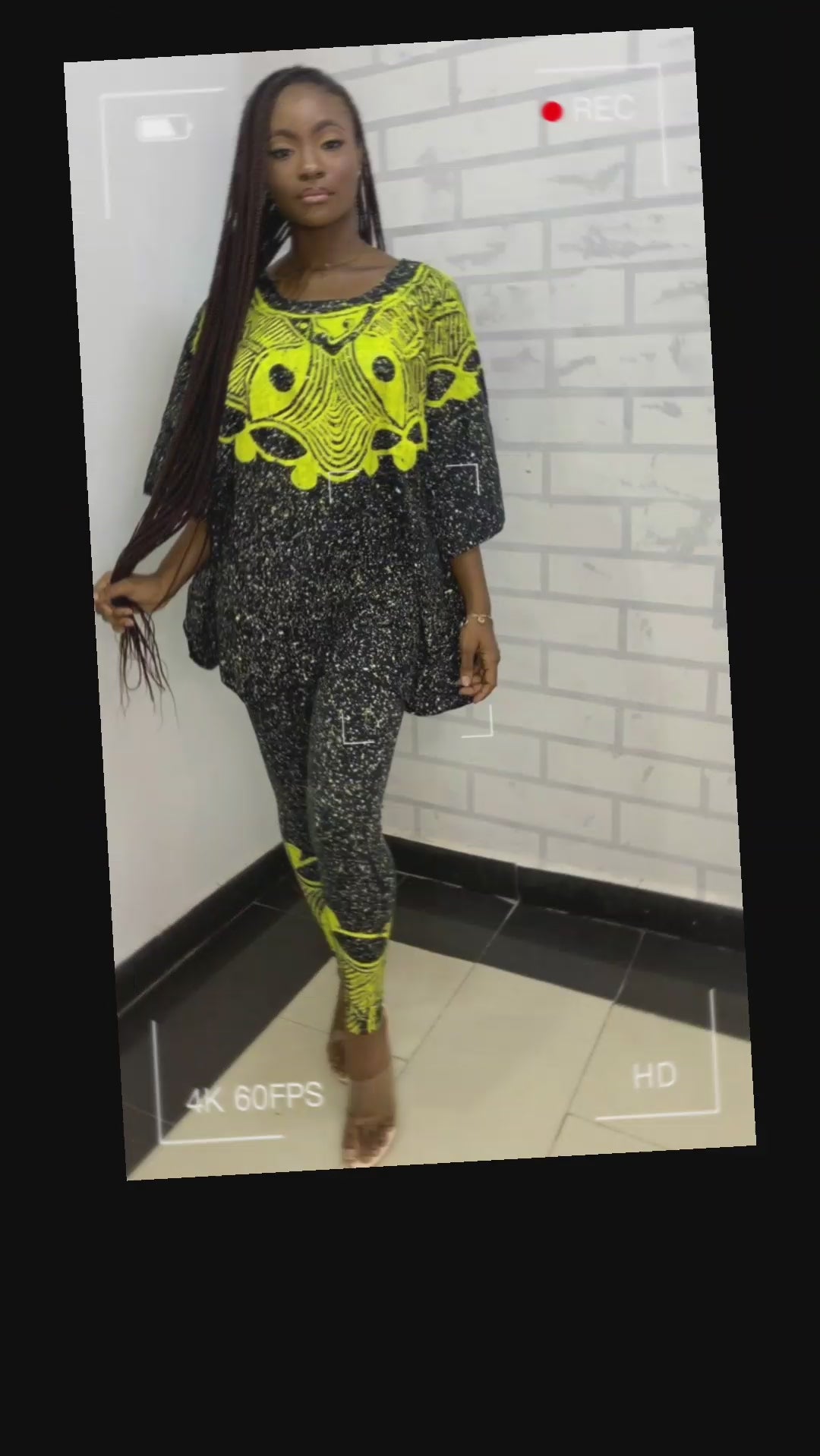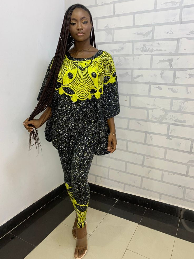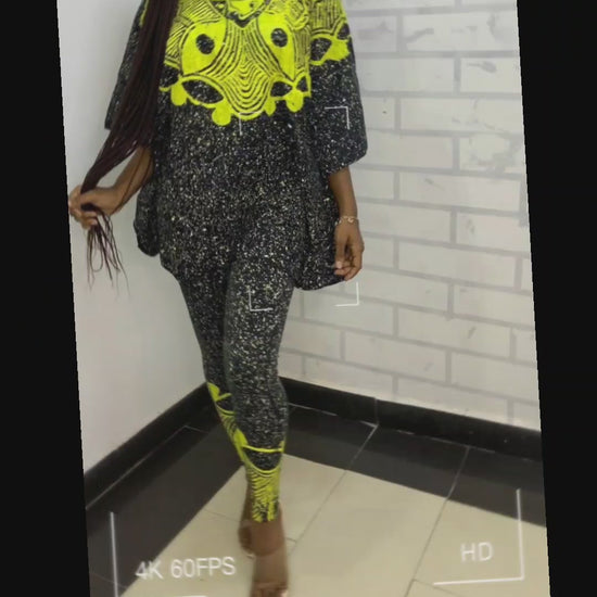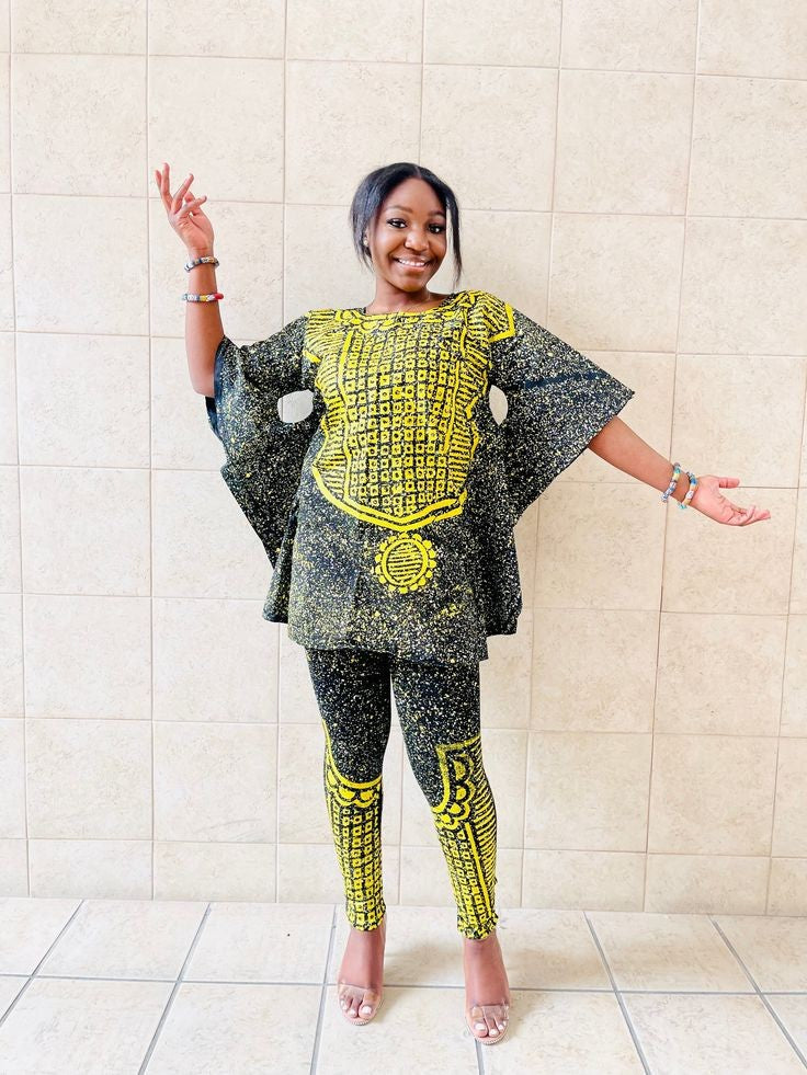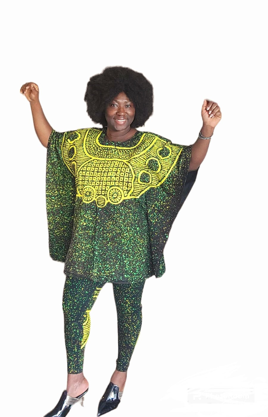 Batik Leggings with Kaftan Top. This fits a large, has limited stretch in the leggings. Top is cotton fabric. Only color green