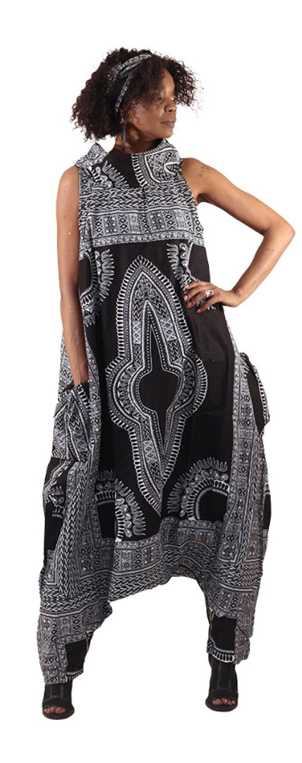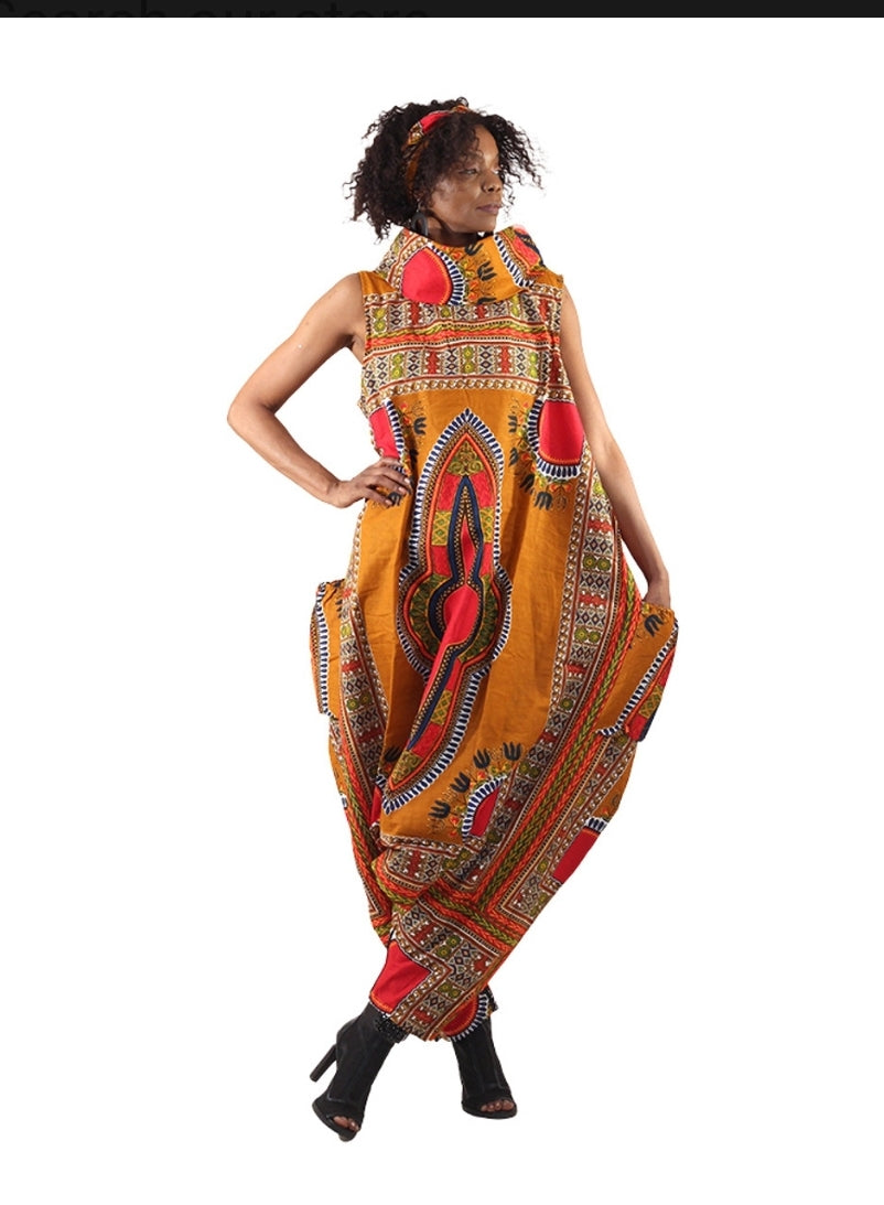 The Big Dashiki Zip Jumpsuit is perfect for everything from relaxed outings to special celebrations. Its sleeveless design, paired with a high detachable turtleneck, provides flexibility in styling. The jumpsuit features loose parachute pants that taper at the ankles, combining trendy style with ease of movement for all-day comfort. Accentuated with vibrant patterns, it brings a bold African aesthetic to your look, making it an excellent choice for those who want to make a stylish statement.