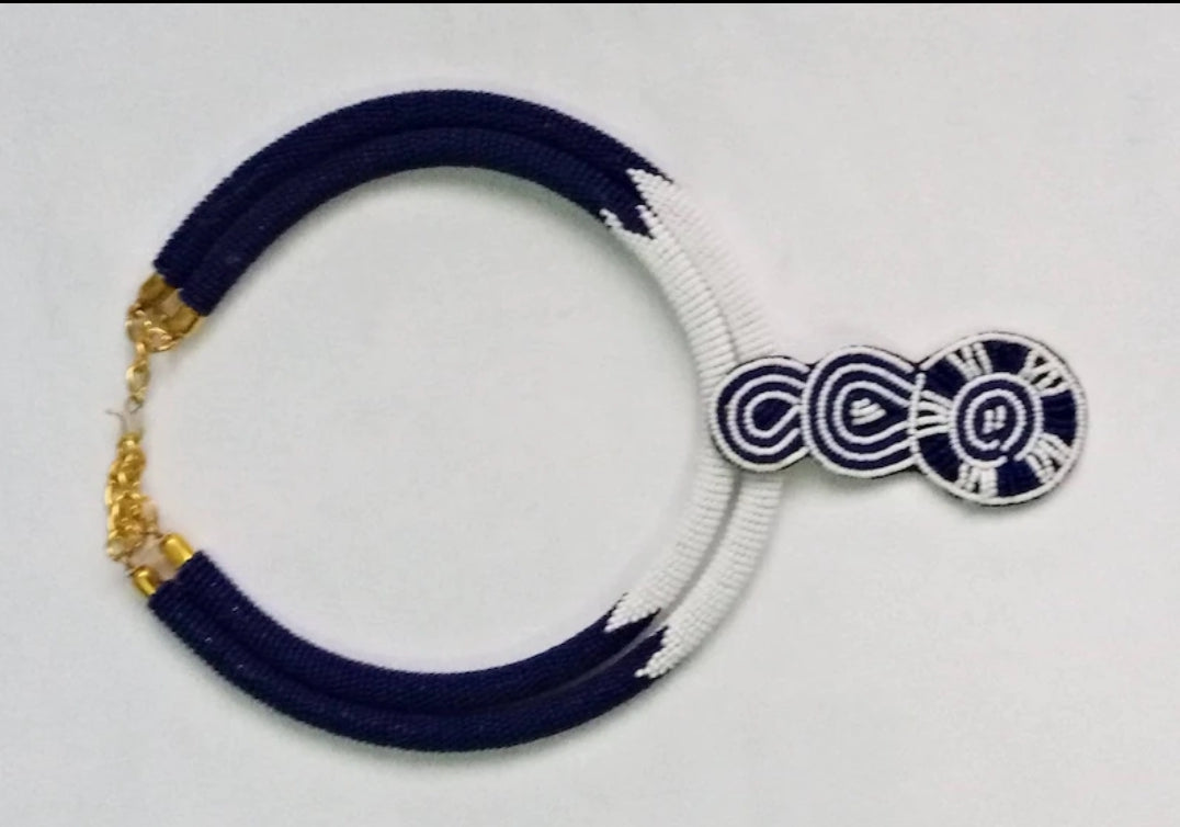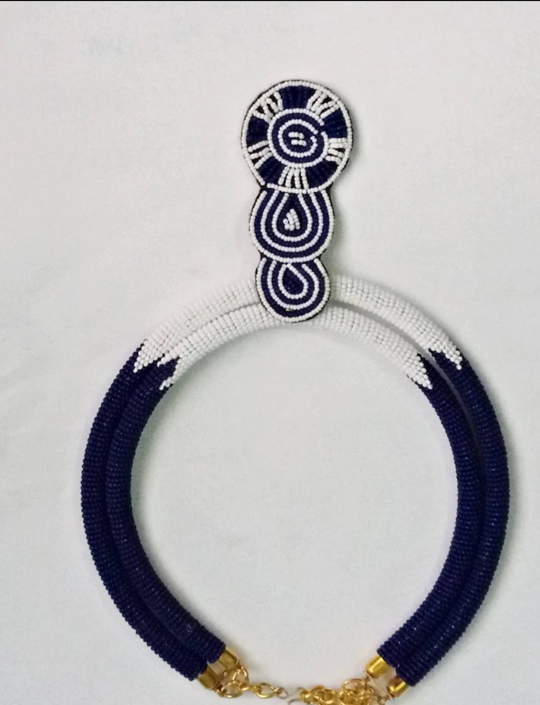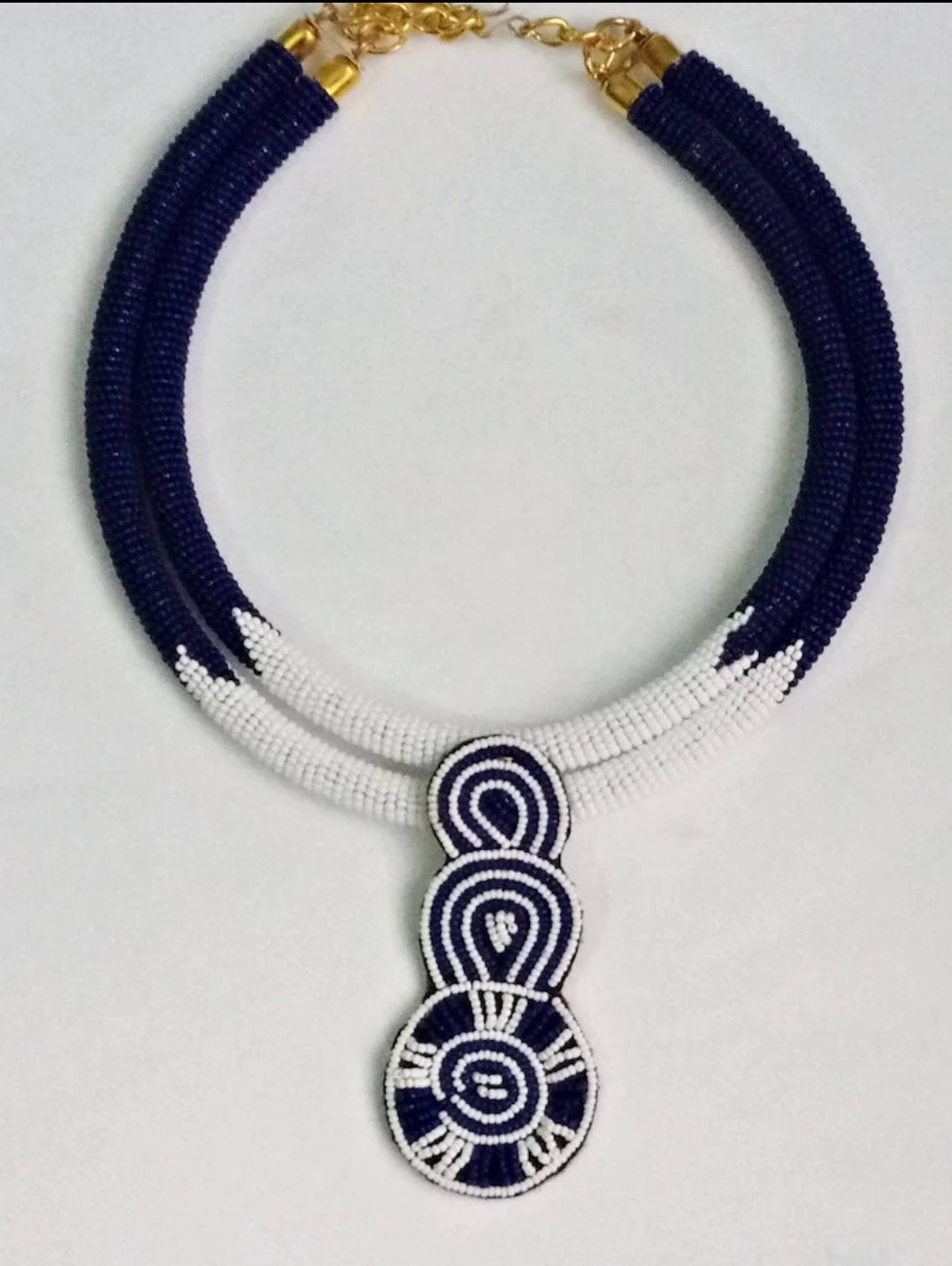Bold and distinctive, this Blue and White Double-Row Fine Bead Choker is a stylish accent for any ensemble. The choker is made of two chokers with a three layer, circular pendant connecting them. It is made of very fine black and white beads with a traditional African design on the pendant. Made in Kenya.