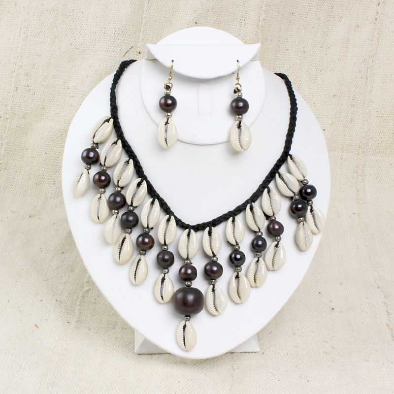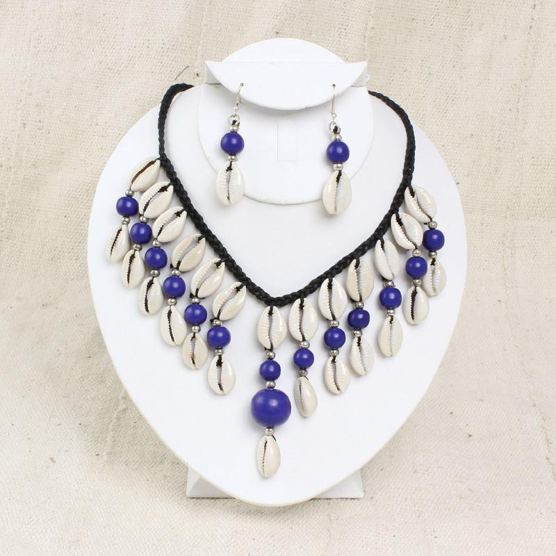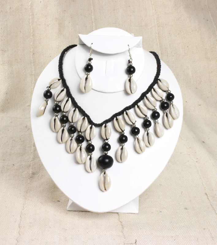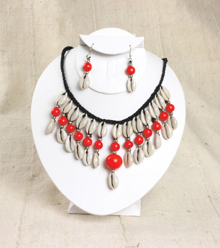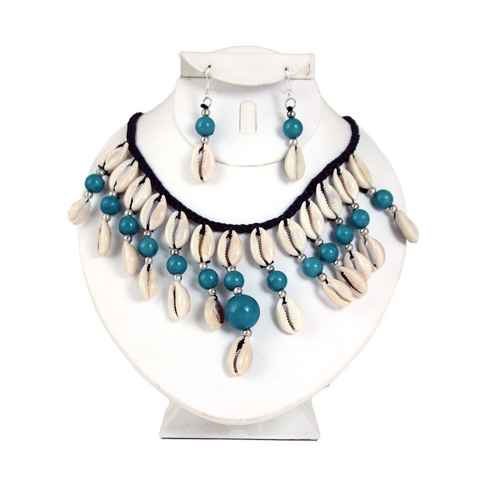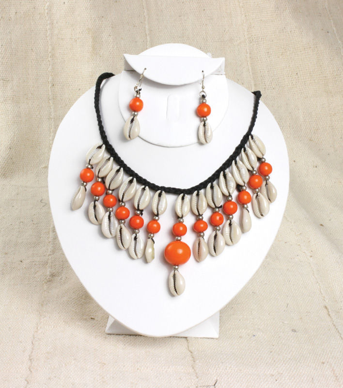 Necklace is 12" long, earrings are 2" big, and strands of beads with cowry shells are 2.5" long.