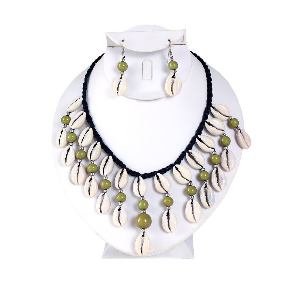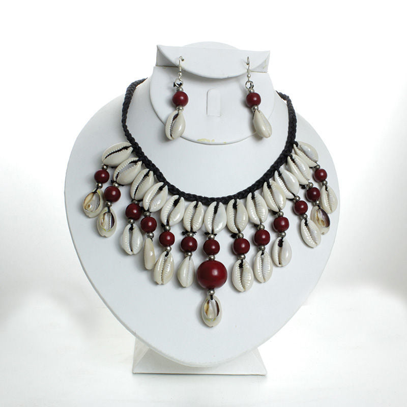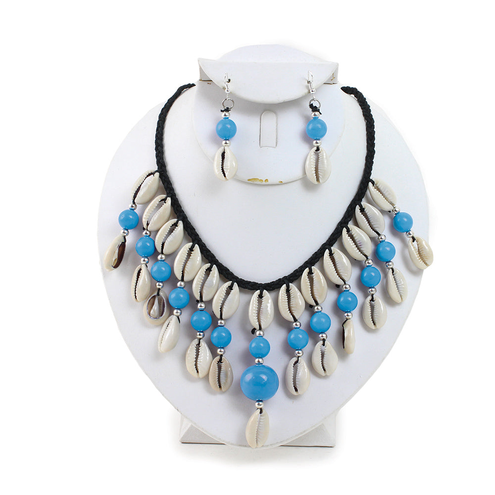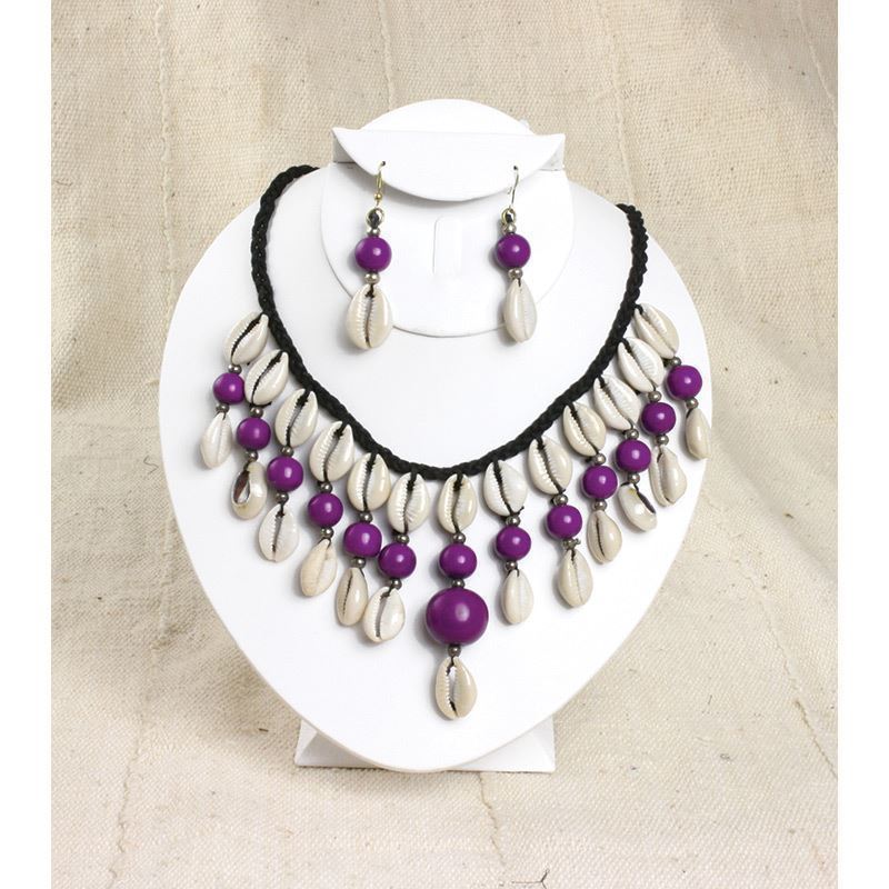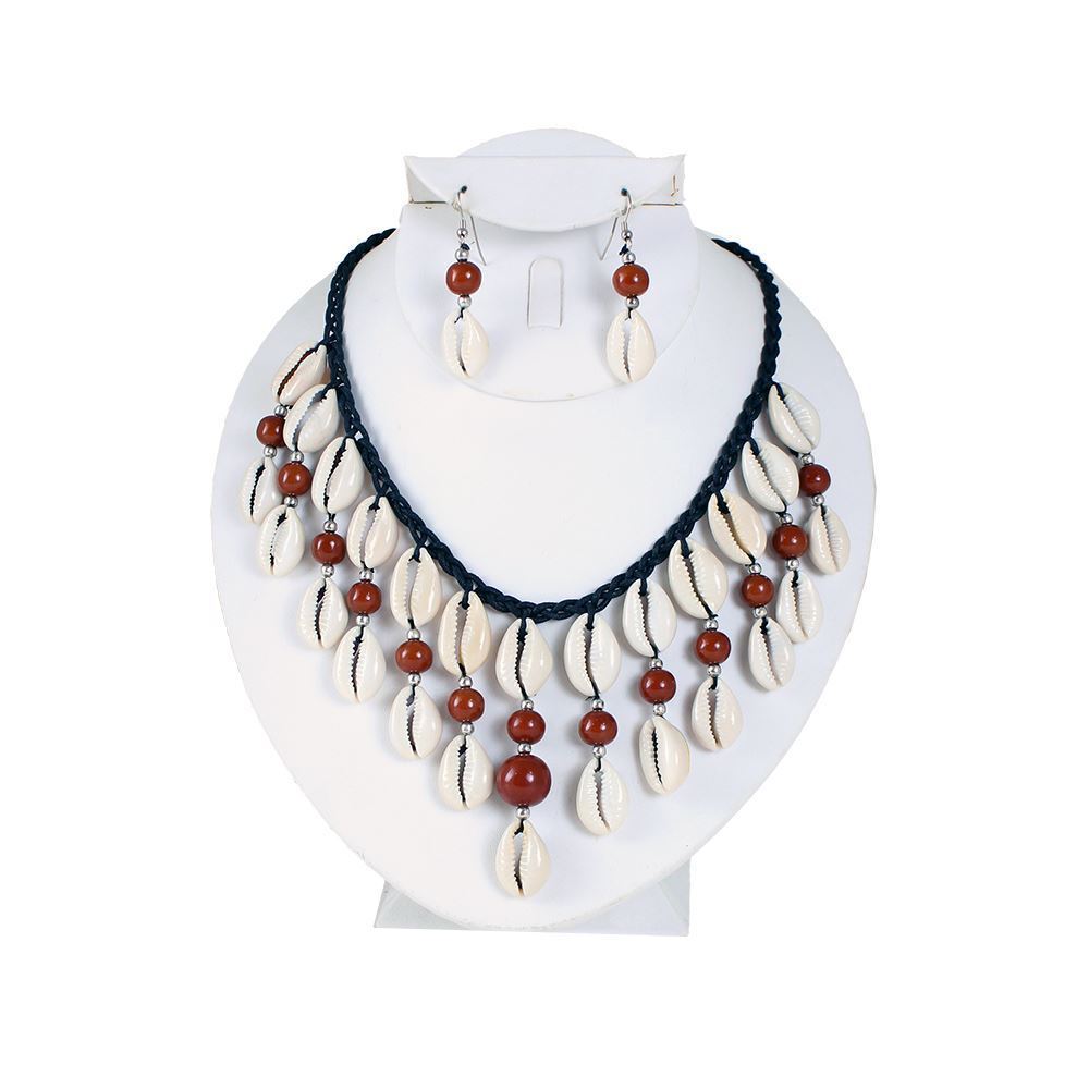 Necklace is 12" long, earrings are 2" big, and strands of beads with cowry shells are 2.5" long.
