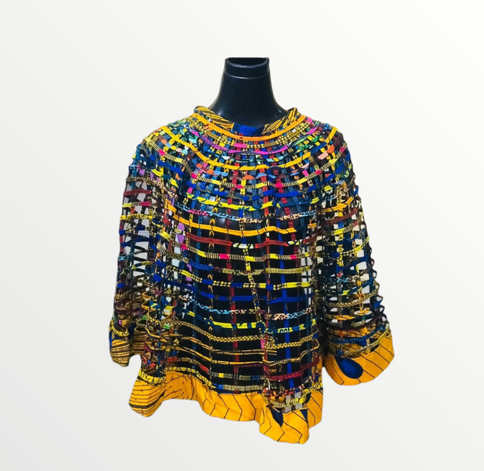 This handmade unique piece is made from strips of different african fabrics. They are carefully sown strip by strips the artistically put together into a cape. Can be worn as a casual top over jeans with a solid tank inside it or adorned over a solid gown for an evening event.