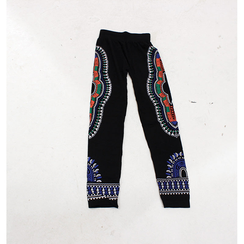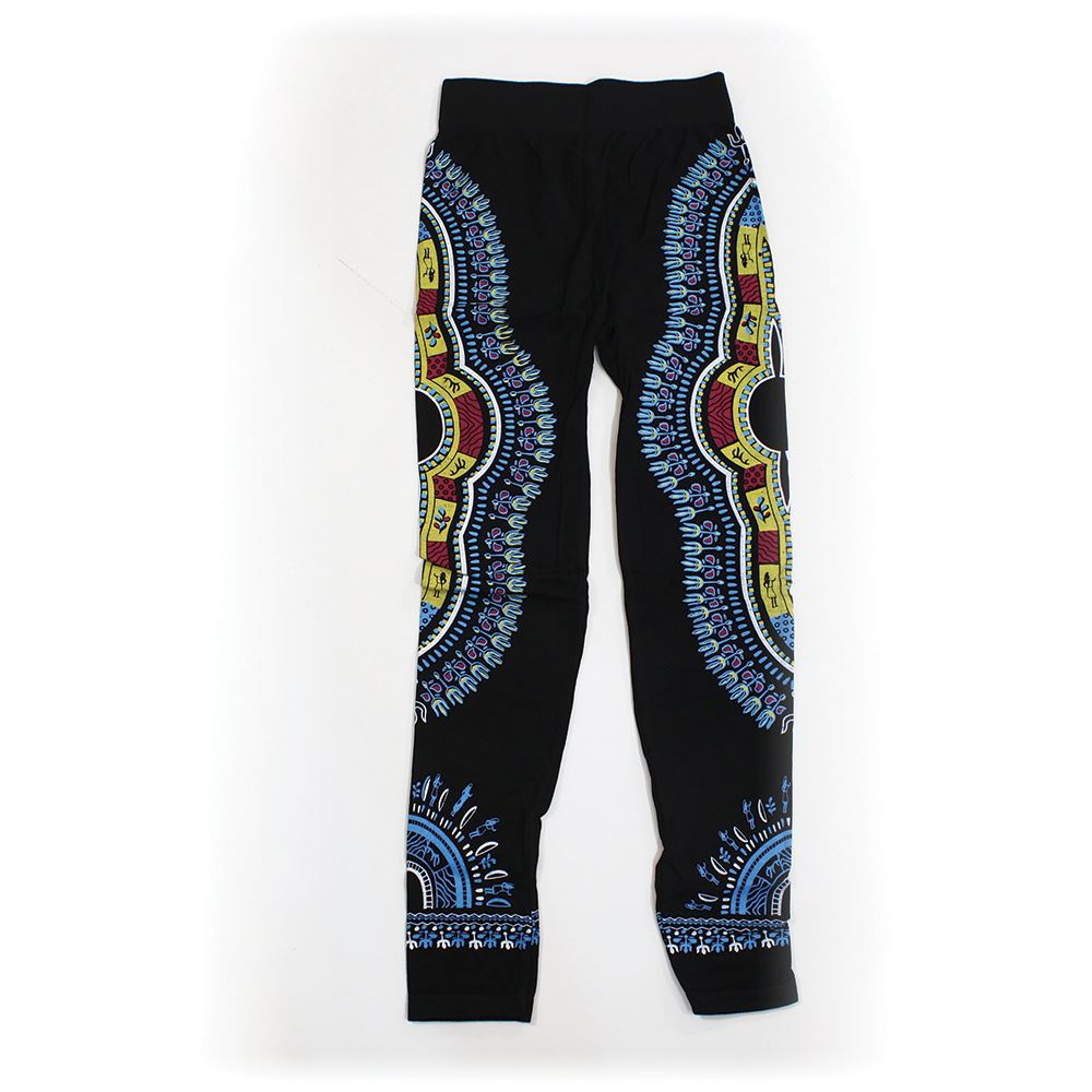 Traditional Print Black Leggings. Comfort, ease, and culture together. 35" long. 26" inseam. Fits up to 32" waist and 40" hips. 95% cotton/5% spandex.