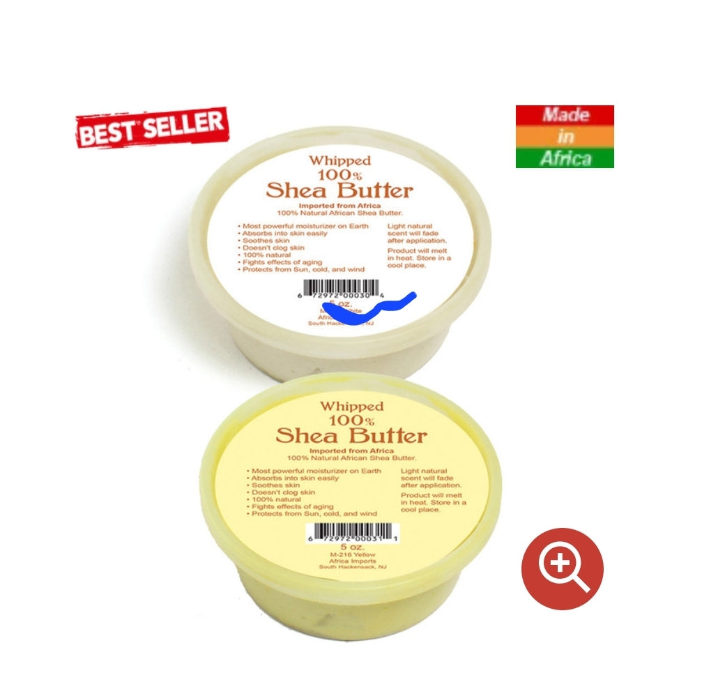 Pamper your skin and hair with our 100% Natural Whipped Shea Butter. Crafted from the African Shea Tree nut, our butter has been whipped to a creamy texture for easy application. Loaded with fatty acids, it gives your skin the best moisture it needs. This shea butter is bursting with essential vitamins that make your skin and hair look and feel smoother, softer, and more radiant. It nourishes and guards against harsh weather and sun. It also works as a hair conditioner. This product comes in a 5 oz container and is made in Ghana.